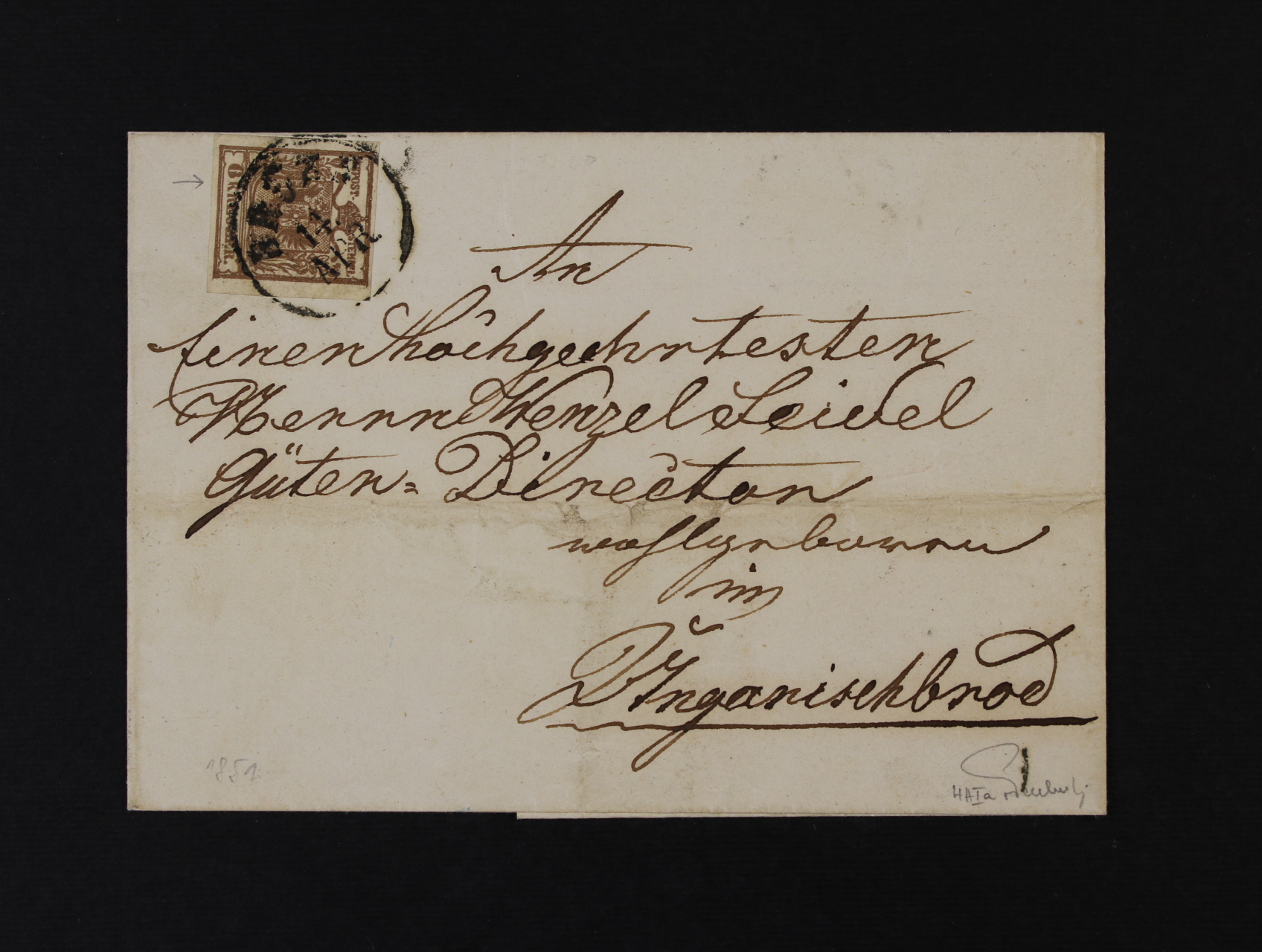 skl. dopis z r. 1851 do Uh. Brodu, frank. zn. Fe. č. 4 HP s DV vyštípnutá nožička K - KRE.., pod. jednokruh. raz. BRÜNN 11.APR., průch. řádkové raz. U. HRADISCH, přích. raz. Uh. Brod 15.APR.