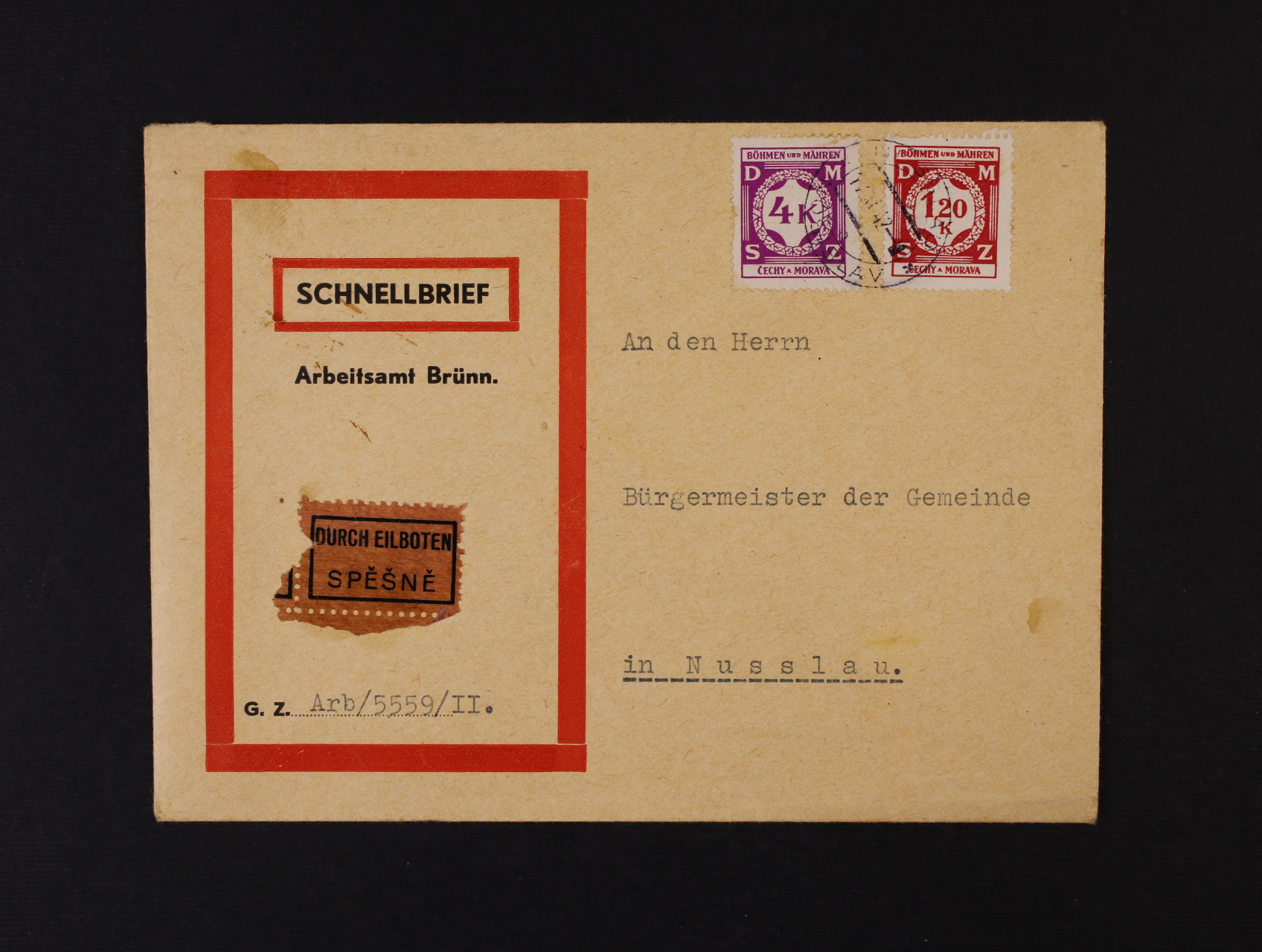 služební obálka s přítiskem CHNELLBRIEF Arbeitsamt Brünn + dvojjazyčná nálepka DURCH EILBOTEN - SPĚŠNĚ, frank. zn. SL č. 7 + SL 11, pod. raz. NOSISLAV 15.11.42