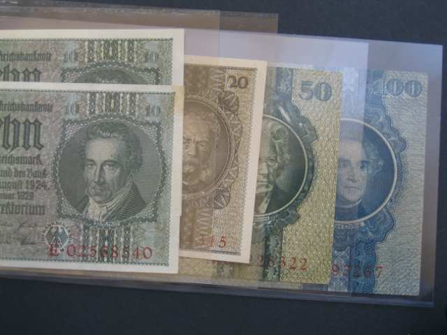 738 10 Rm (2ks červený a hnědý číslovač), 20 Rm, 50 Rm, 100 Rm 1929 - 35, průsvitka ornament - válečné, platné na čs. území, Ros. 173c, 174c, 175d, 176c, Pi. 180b, 181b, 182b, 183b 800