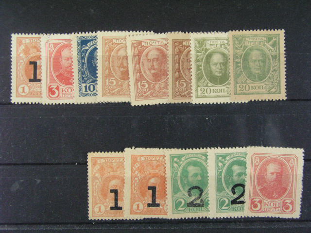 znamkova platidla 1, 2, 3, 10, 15, 20 Kopek 1915, 5x bar. varianta, celkem 13ks, Pi. 16, 20 - 23, 32 - 34