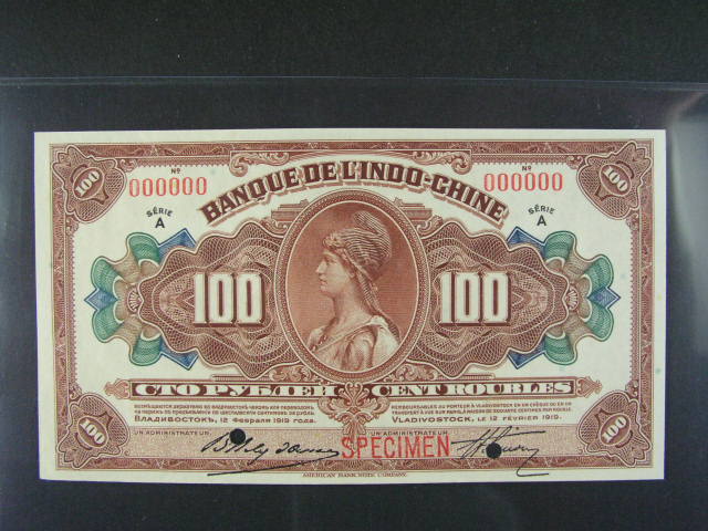 Vladivostok, Banque de L Indo-Chine 100 Rubles 12.2.1919 anulat s pretiskem SPECIMEN, 2x perf. otvory, Pi. S1258