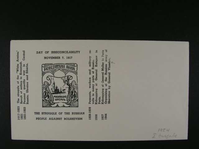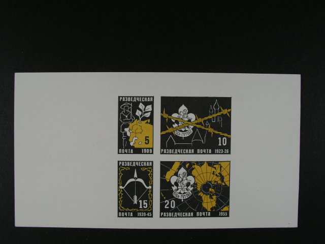 2110 obalka s pritiskem RAZVEDCESKAJA POCTA 1923-26 - ekzilove vydani ruskych skaut? v Kanade z r. 1955 a otisk 4 zn. v hodnotach 5 - 20 v arsikove úprave na kousku papiru bez lepu 400