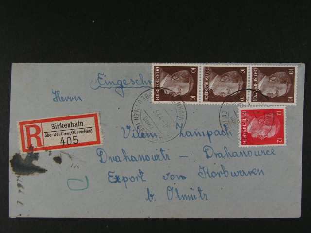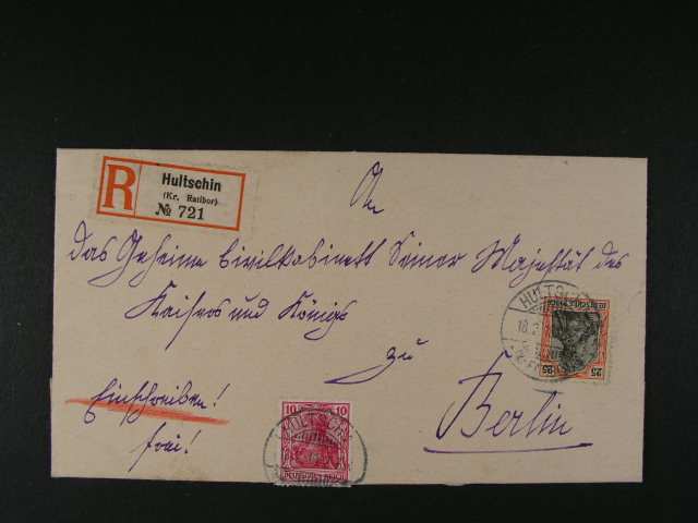 R-dopis frank. zn. 25pf a 10pf Germania s dennim raz. HULTSCHIN 18.2.18 (od r. 1923 cs. územi), zajimave