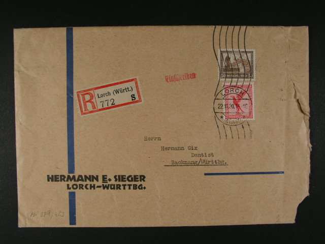 firemni R-dopis frank. zn. Mi. c. 379, 454 se stroj. raz. LORCH 22.11.30, leva strana pri otevirani natrzena