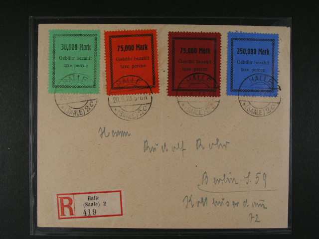 lokalni vydani 1923 Halle - dva R-dopisy do Berlina frank. nalepkami Gebühr Bezahlt 30000, 75000 a 250000 MK, pod. raz. HALLE 19.9.23 resp. 20.9.23, prich. raz., zajimave