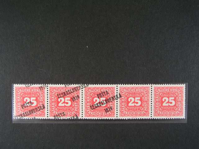 378 zn. c. 74 ve vodorovne 5ti-pasce s posunutym pretiskem, posledni dve zn. bez pretisku, zk. Gilbert 1000