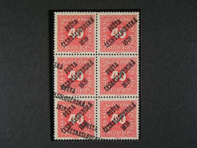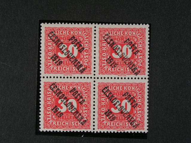 379 zn. c. 74 ve ctyrbloku s vicenasobnym pretiskem, zk. Gilbert, kat. cena 5000 Kc 3500