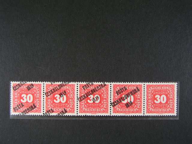 393 zn. c. 77 ve vodorovne 5ti-pasce se silnym posunem pretisku vlevo, posledni zn. bez pretisku, zk. Gilbert 1000