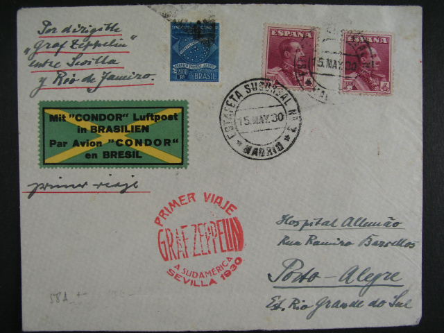 1323 Spanelsko - dopis prepr. SAF 1930 do Brazilie, dofrank. zn. 2000Rs SYNDICATO CONDOR (smisena frankatura) Sieger 58 Aa, cerveny palubni kaset + pruch. a prich. raz. 5000