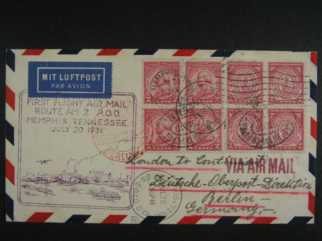 1324 USA - dopis z Memphisu do Berlina prepr. 1. letem Memphis - N. York, dale pak lodi Bremen a katapultovym letem, pod. raz. MEMPHIS 2.6.30, cerveny let. kaset + pruch. a prich. raz., velmi dekorativni 1000