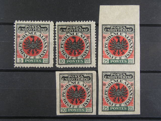 1327 nevydane zn. 3. Albaner kongresses v hodnotach 5 a 10cts s perforaci a 25cts (dvoupaska s okrajem) a 50cts strihane 600