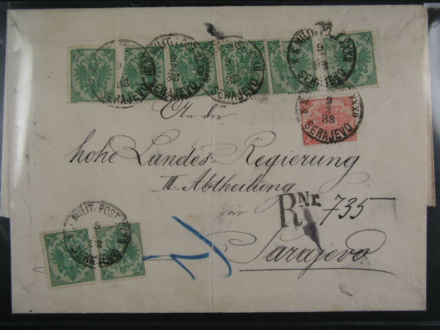 1337 8x tezsi mistni R-dopis SARAJEVO vc. obsahu (soudni spis), frank. kamenotisky 8x 3kr + 5kr, naprosto mimoradna unikatni frankatura, navic tzv. podvodna frankatura (podruhe pouzite znamky rozstrizenim), pod. raz. K.K. MP SERAJEVO 9.3.88, ojedinela nabidka, vhodne pro vyst. exponat 92000