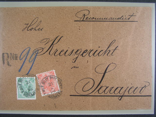 1339 2x tezsi R-dopis v miste , frank. zn. 3 + 3 + 5kr, pod. raz. K.u.K. MP SARAJEVO 9.12.98, unikatni frankatura, mimoradna nabidka 42000