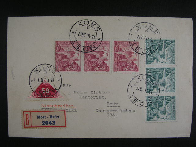 R-dopis frank. vodorovnou tripaskou zn. c. 331 + 332 a zn. DR 2 s raz. BRÜX 15.2.38