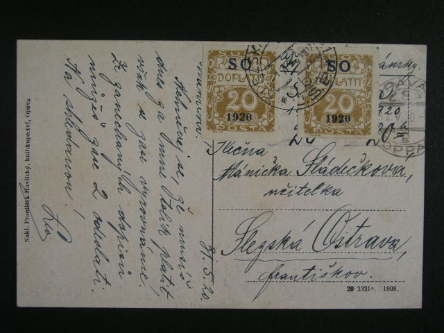 665 bar. pohlednice do Ostravy zaslana nevyplacene, v Ostrave dofrank. zn. SO c. 36 (2x), s raz. SLEZSKA OSTRAVA 31.5.20, zajimave 800