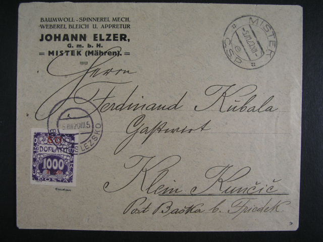 666 firemni dopis do Kuncic zaslany nevyplacene, pod. raz. MISTEK 5.8.20, dofrank. zn. SO c. 43 s raz. BASKA SLEZSKO 5.8.20 500