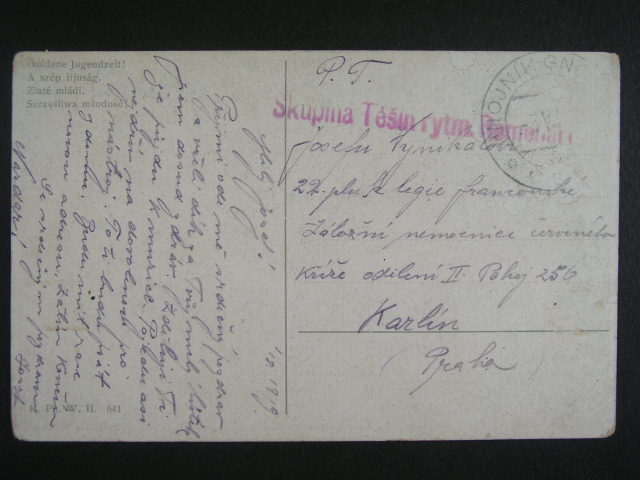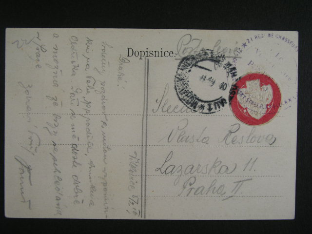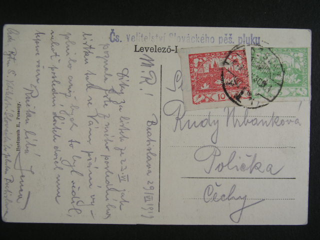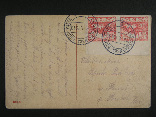 671 celistvost do Prahy s dennim pod. raz. HNOJNIK 3.8.1919 a prid. utvar. raz. Skupina Tesin rytm. Romm... 500
