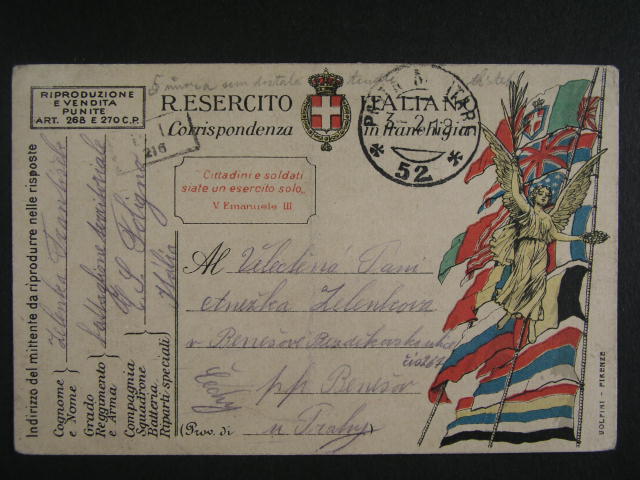 675 Italie - oficielni listek italske FP do Benesova s pod. raz. POSTA MILITARE c. 52 3.2.19 700