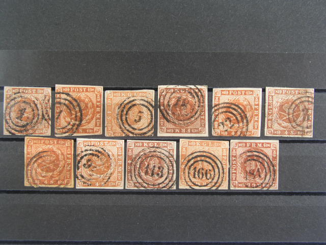 1350 sestava 11 ks zn. Mi. c. 4 a 7 s cis. razitky 1, 5, 18, 22 ... 600