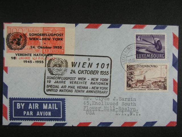 let. dopis do USA frank. zn. Mi. c. 406, 536, pod. raz. LUXEMBOURG 20.10.55 + nalepka a let. kaset WIEN - NEW YORK , prich. raz.