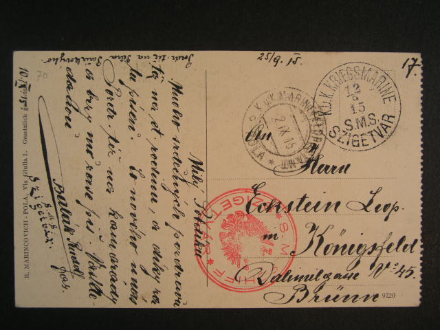 celistvost s pod. raz. K.u.K. MFPA POLA 2.9.15 + lodni raz. S.M.S SIGETVAR v cerne barve + palubni kaset v cervene barve, lux. kvalita