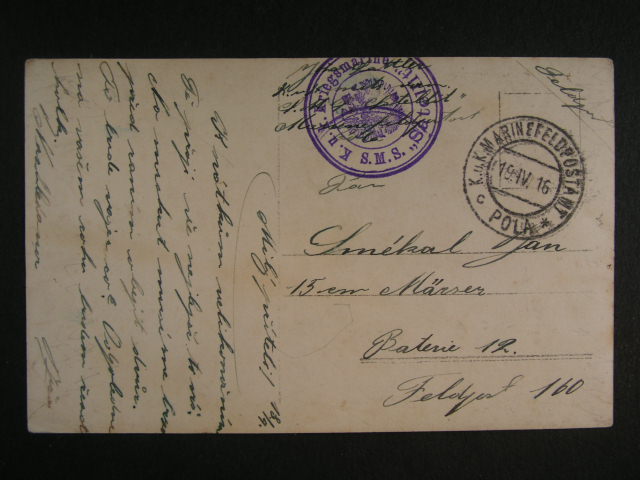 celistvost na FP c. 160, pod. raz K.u.K. MFPA Pola 19.4.16 + lodni raz. S.M.S. SATELIT