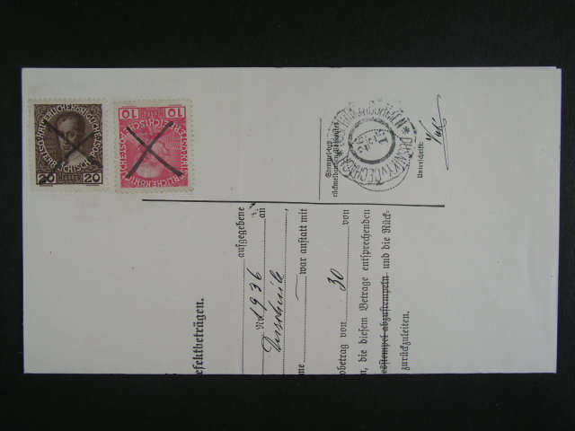 Rückmeldung ... - frankodefektbeträgen s douctovanim 30h (20 + 10h) chybejiciho EX-poplatku na povolavacim zozkazu z r. 1914, zajimavy doklad, kat. Ferch. 300 EUR
