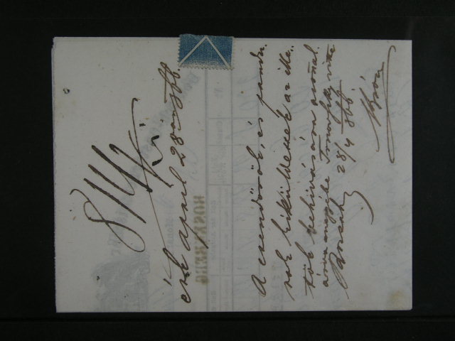 telegrafni blanket z r. 1866 s radk. raz. ROSNNBERG, prelepeny Ondrejskym krizem v modre barve (II. emise), pri otevirani pretrzen