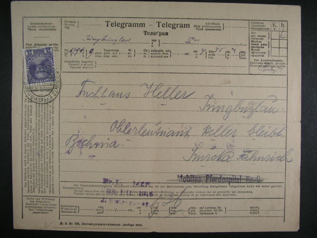 telegram trojjazycny dofrank. zn. Mi. c. 140, pod. raz. PROSNITZ 23.11.15, kat. Fe. 200 EUR
