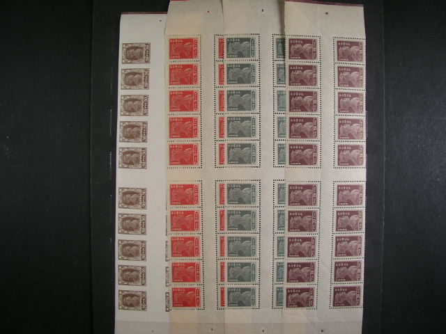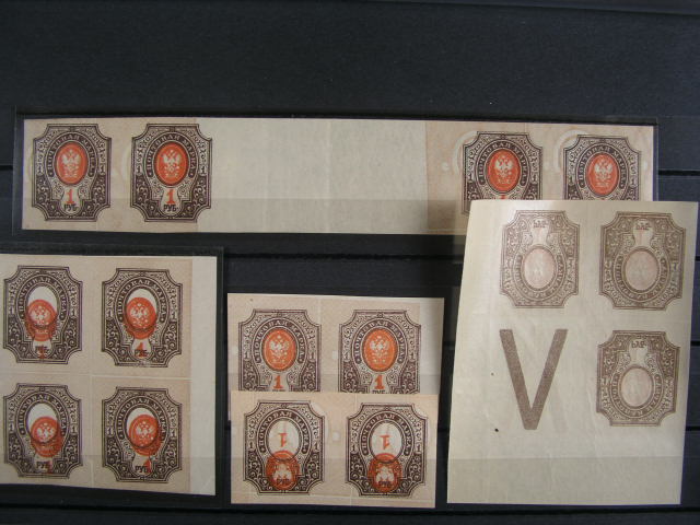 zn. Mi. c. 77 B - ctyrzn. meziarsi vodorovne s posunem podtisk. barvy vlevo + ctyrblok s posunem oranzove barvy dolu + dvoupaska s posunem podtisku vlevo + dvoupaska s obracenym stredem + rohovy ctyrblok s kuponem s kompl. stroj. obtiskem