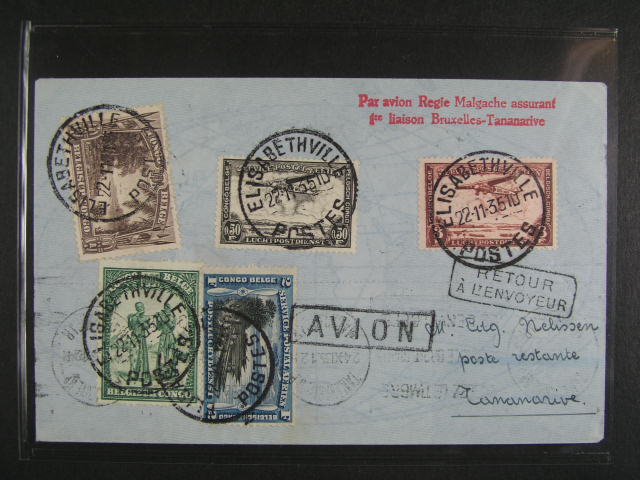 Kongo Belg.- let. dopis na Tananarive, pestra frankatura, pod. raz. ELISABETVILLE 22.11.35 + cerveny let. kaset, pruch. a prich. raz., lux. kvalita