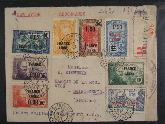 Madagaskar - R-let. dopis frank. mj. zn. Mi. c. 269, 306, pod. raz. SAINTE MARIS 2.JUL.45 + cenzurni paska, pruch. a prich. raz., velmi zajimave, dekorativni