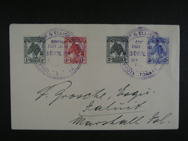 Oceanie - Gilbert and Ellice - dopis ma Marshallovy ostr. frank. zn. Mi. c. 8 - 11, pod. fialove raz. GILBERT AND ELLICE ... 30.NOV.1911, prich. raz.