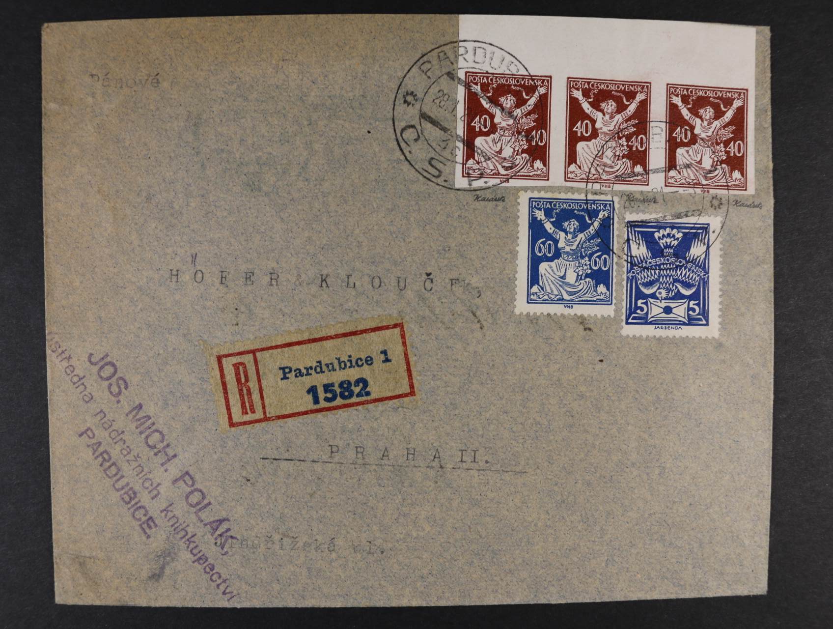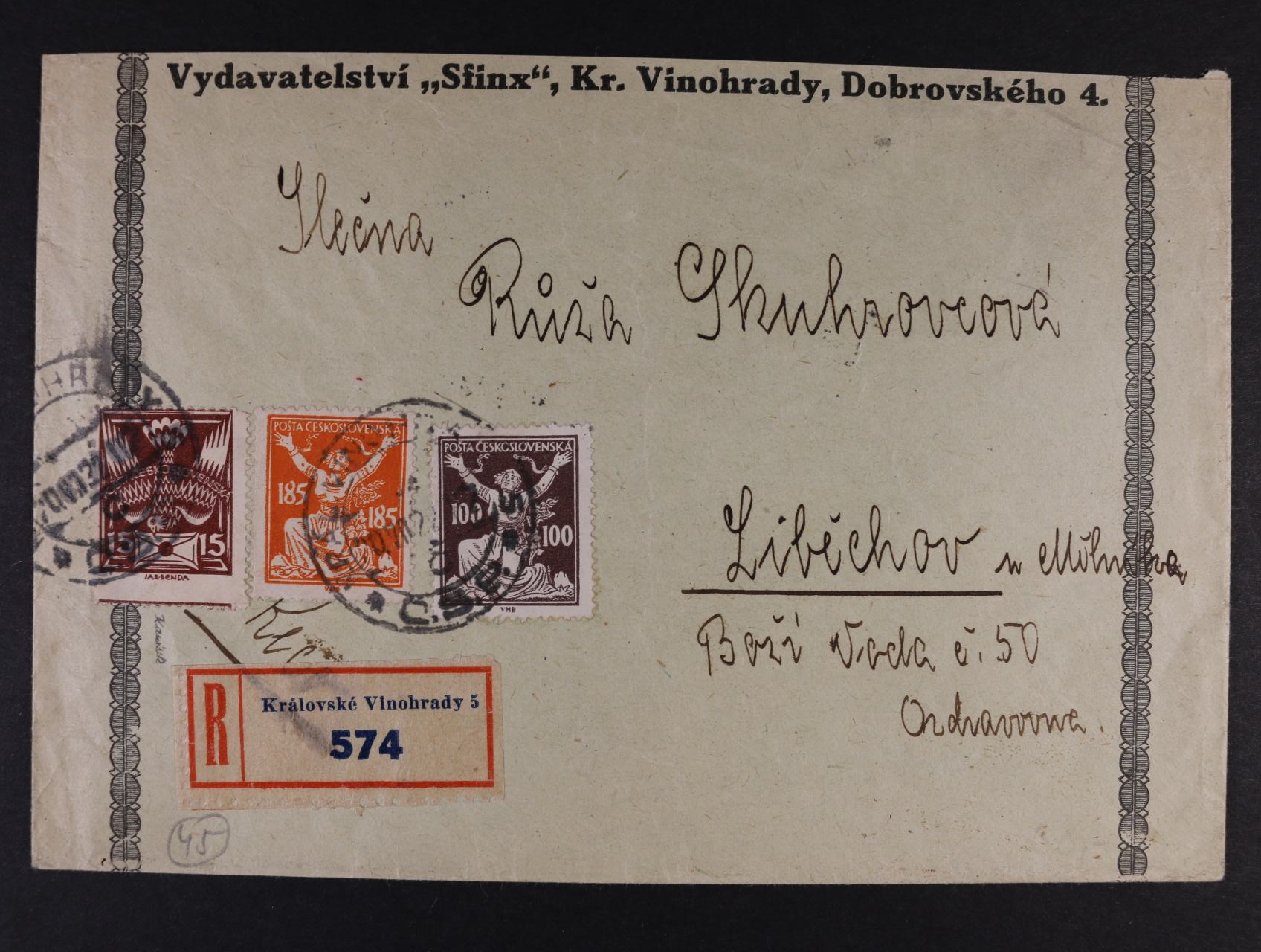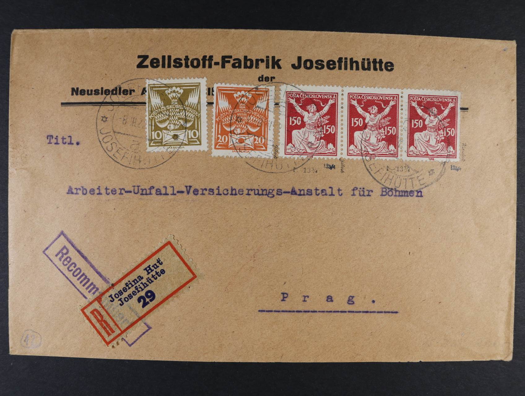 514 firemní R-dopis do Prahy frank. mj. zn. č. 159 B ve vodorovné třípásce, zk. Gilbert, Karásek, pod. raz. JOSEFINA HUŤ 8.3.22, zajímavé, vzácné 2000