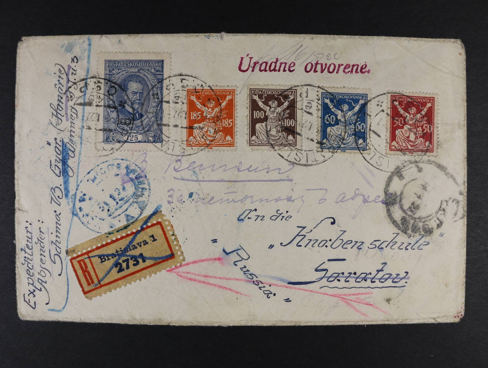 503 R-dopis do SSSR frank. pestrou zajímavou frankaturou, mj. zn. č. 155 DV 1, pod. raz. BRATISLAVA 6.1.22, průch., přích. a cenzurní raz., navíc řádkové červené raz. Úradne otvorené, dopis nedoručen a vácen zpět, velmi vzácná destinace 3000