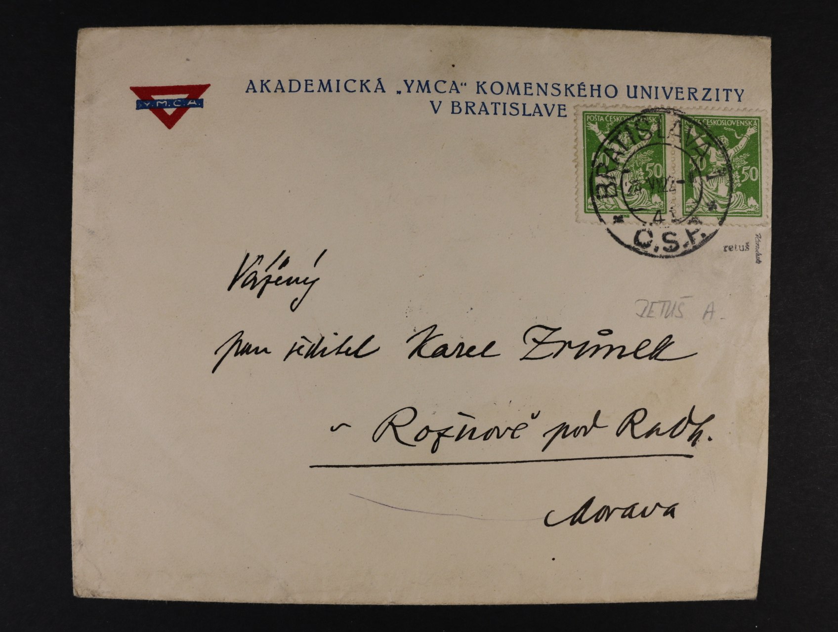 505 firemní celistvost frank. zn. č. 156 ve vodorovné dvoupásce s RT A (retuš vajíčka), pod. raz. BRATISLAVA 23.6.22, zk. Karásek 1500