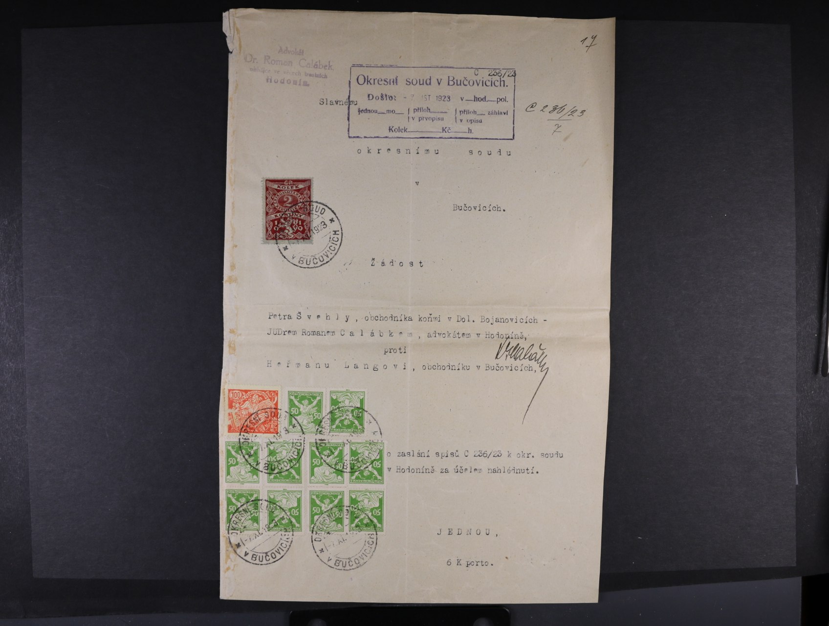 510 žádost o zaslání spisů s poplatkem 6 Kč vyplaceným známkami č. 156 (10x), 173, znehodnoceno fiskálním raz. OKRESNÍ SOUD V BUČOVICÍCH 7.11.28 2000