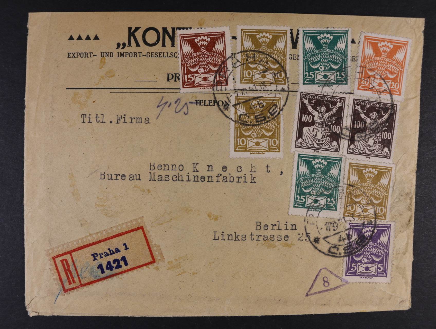 511 firemní R-dopis do Berlína frank. pestrou smíš. frankaturou Holubice + OR, pod. raz. PRAHA 7.11.21, na zadní straně přelepka s oznámením o otevření zásilky + celní, průch. a přích. raz., dopis na třech stranách otevřen, velmi dekorativní 300