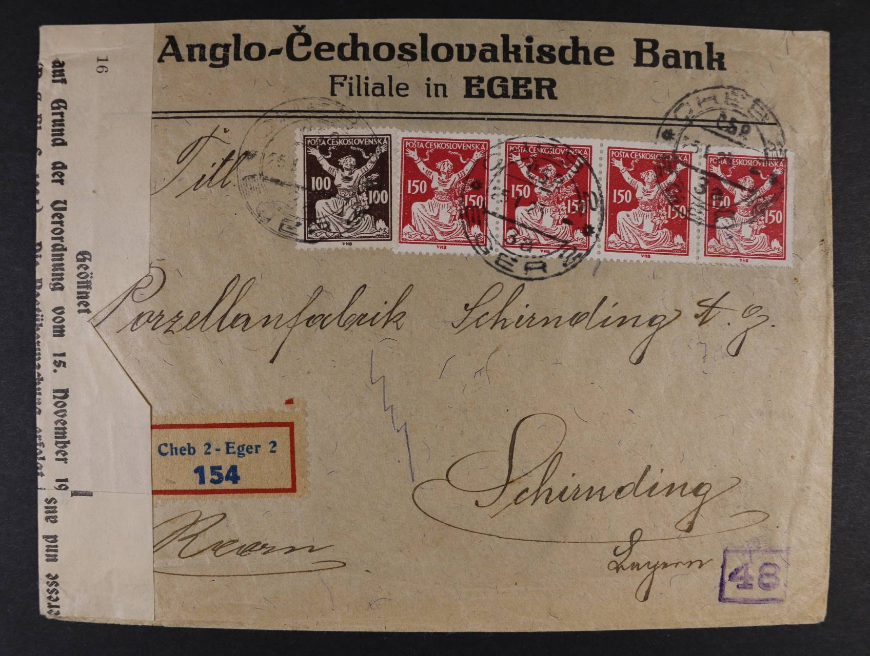 512 firemní celistvost do Německa frank. zn. č. 158 + čtyřpáskou zn. č. 159 A, pod. raz. CHEB 25.1.23, celní přelepka s oznámením o otevření zásilky, celní + přích. raz., velmi zajímavé 1500