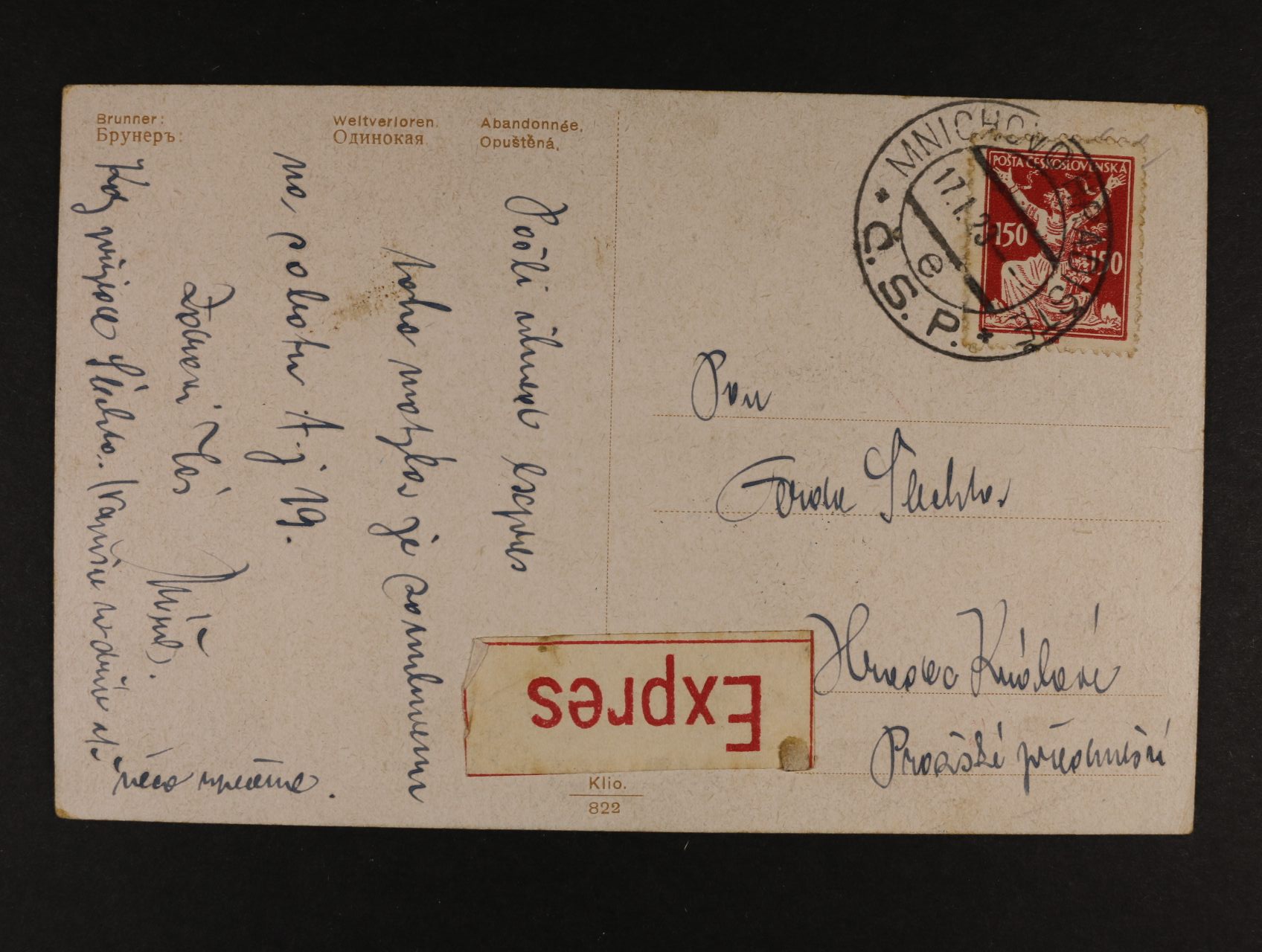 513 EXPRES pohlednice do Hradce Králové, frank. zn. č. 159, pod. raz. MNICHOVO HRADIŠTĚ 17.1.23 300