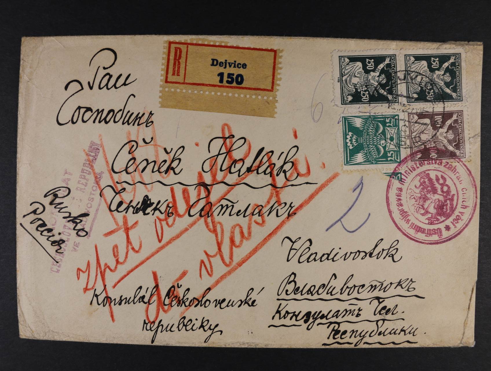 517 konzulární R-dopis do Vladivostoku frank. mj. zn. č. 158 + svislou dvoupáskou zn. č. 161, pod. raz. DEJVICE 16.9.22 + červené gumové úřední raz.Ústřední výpravna ministerstva zahraničí ... + řádkové přích. raz. KONZULÁT ČS. REPUBLIKY VE VLADIVOSTOKU 1300