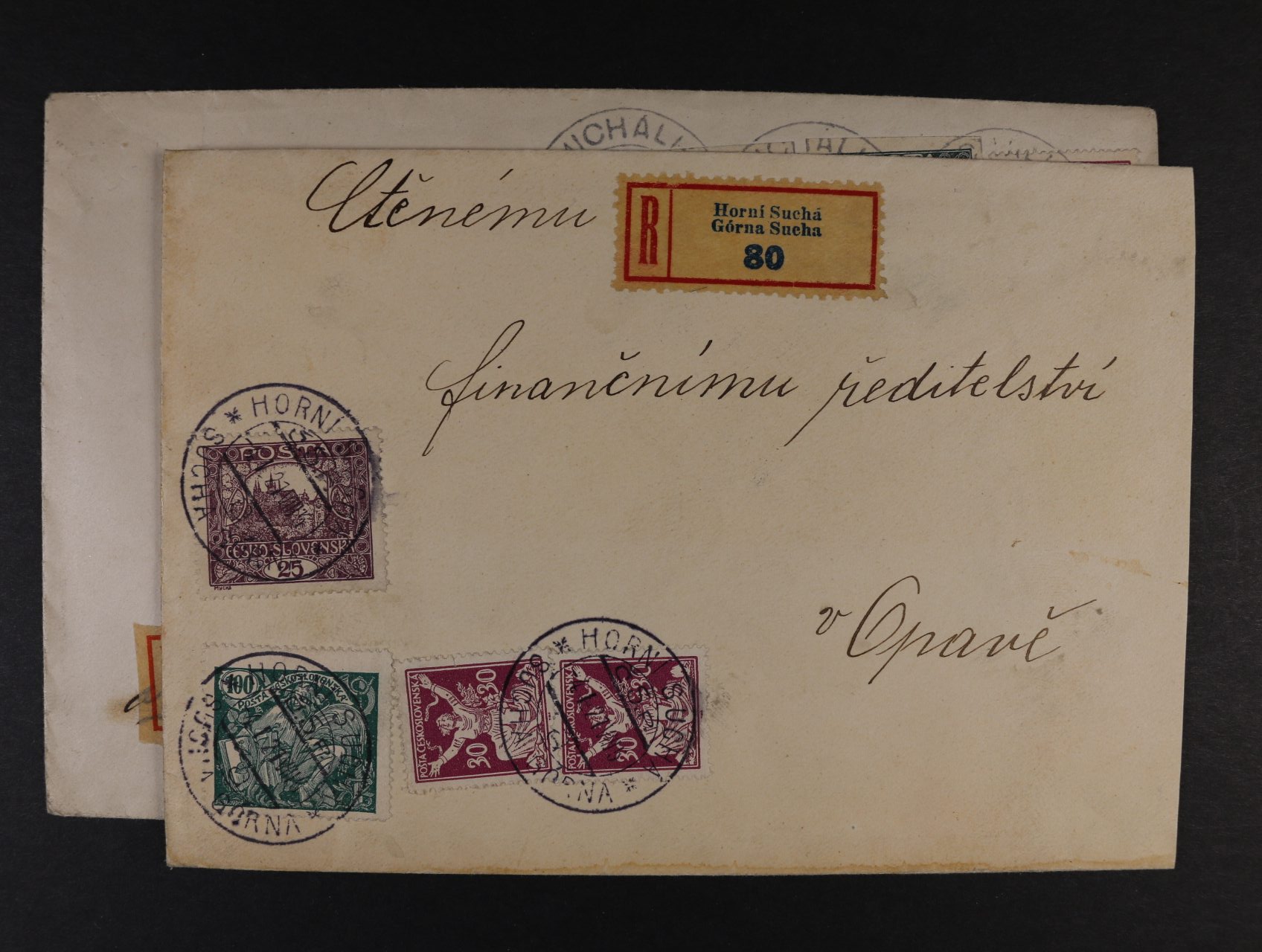 518 dva R-dopisy frank. smíš. frankaturou OR + Hradčany + HaV s raz. HORNÍ SUCHÁ 4.1.27, resp. MICHALKOVICE 8.12.20, přích. raz., velmi zajímavé 500