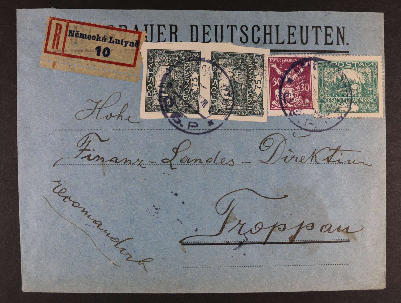 519 firemní R-dopis do Opavy frank. smíš. frankaturou OR + Hradčany, pod. raz. NĚMECKÁ LUTYNĚ 21.11.20 + přích. raz. 500