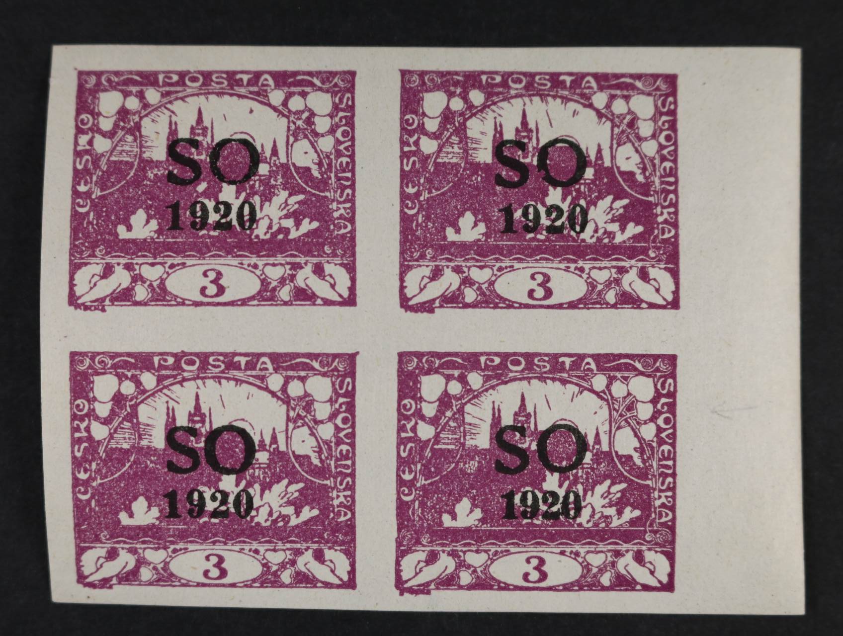 zn. OT č. 3 - levý horní roh. 10ti-blok se dvěma ST, kat. cena 770 Kč