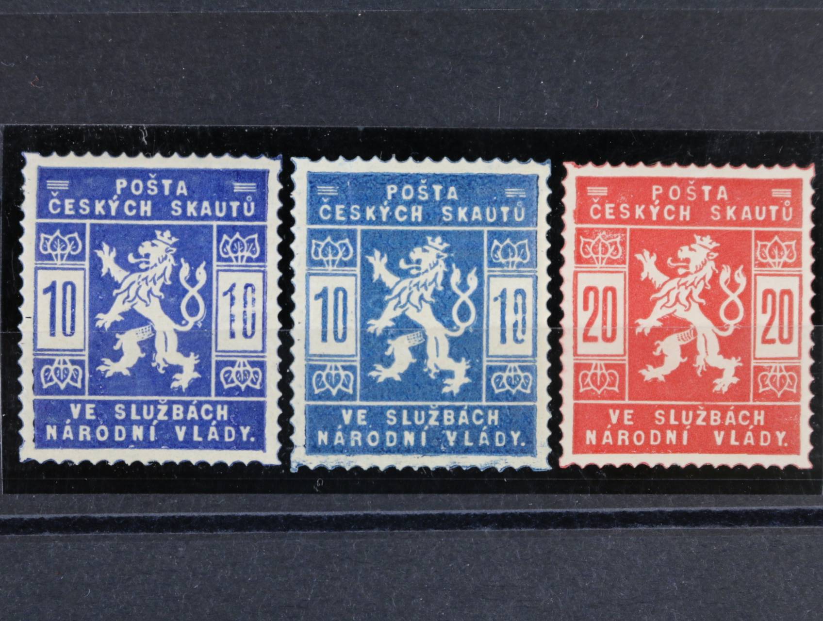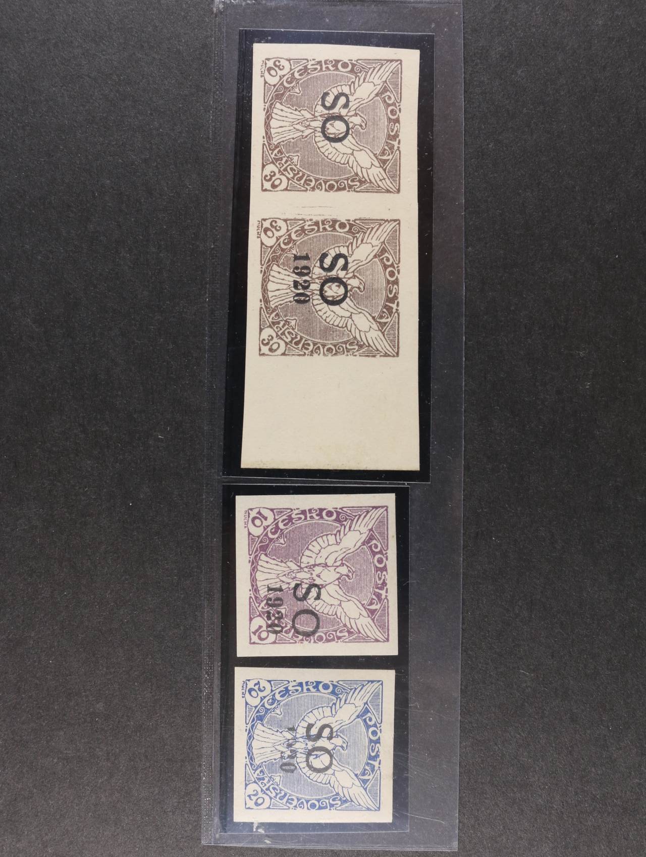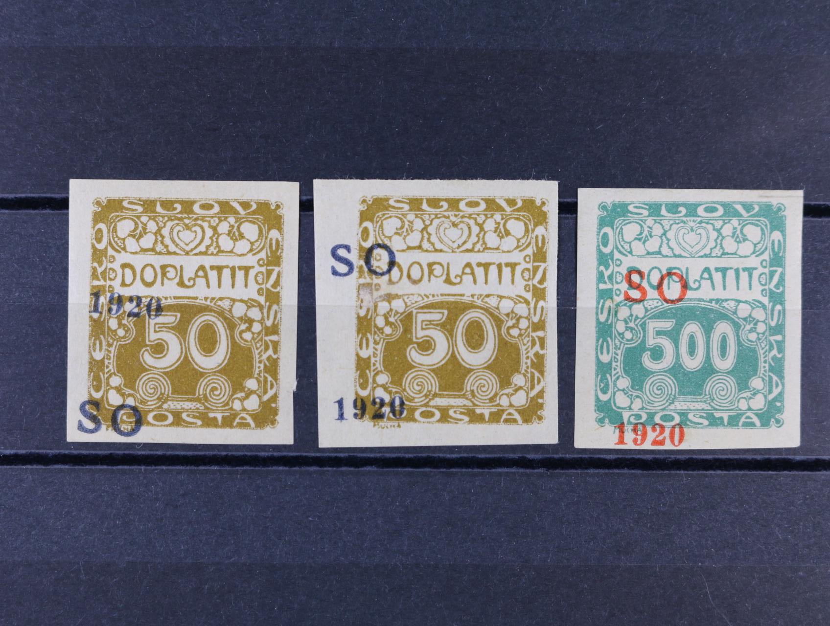 zn. SO č. 30 s posunem přetisku vpravo, SO 31 s nedotiskem letopočtu 1920, SO 32 ve vodorovné dvoupásce s pravým okrajem a vynechaným letopočtem 1920 na jedné zn.
