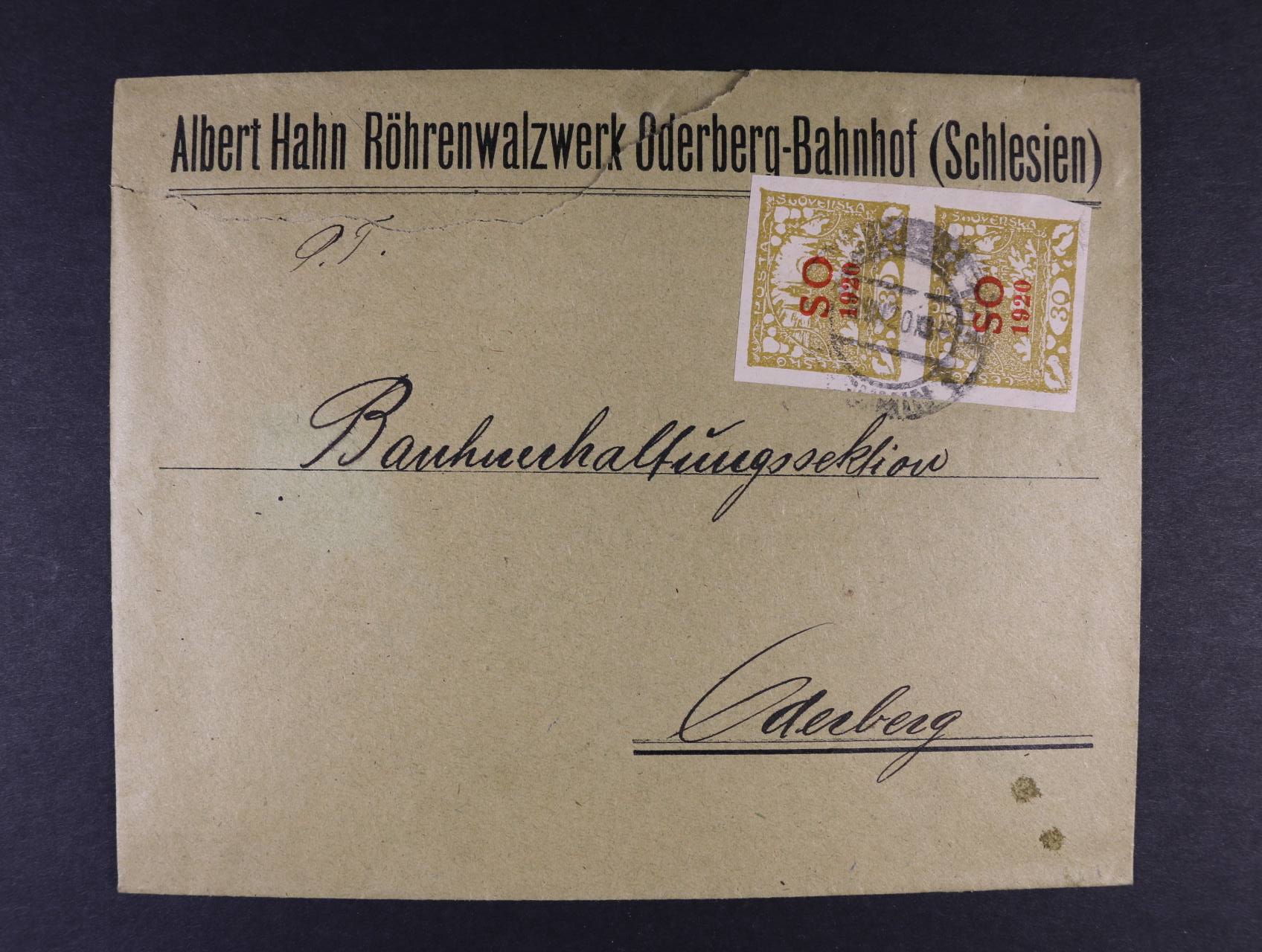 firemní celistvost frank. dvoupáskou zn. SO č. 9, pod. raz. ODERBERG 8.8.20, obálka v horní části mimo zn. natržena