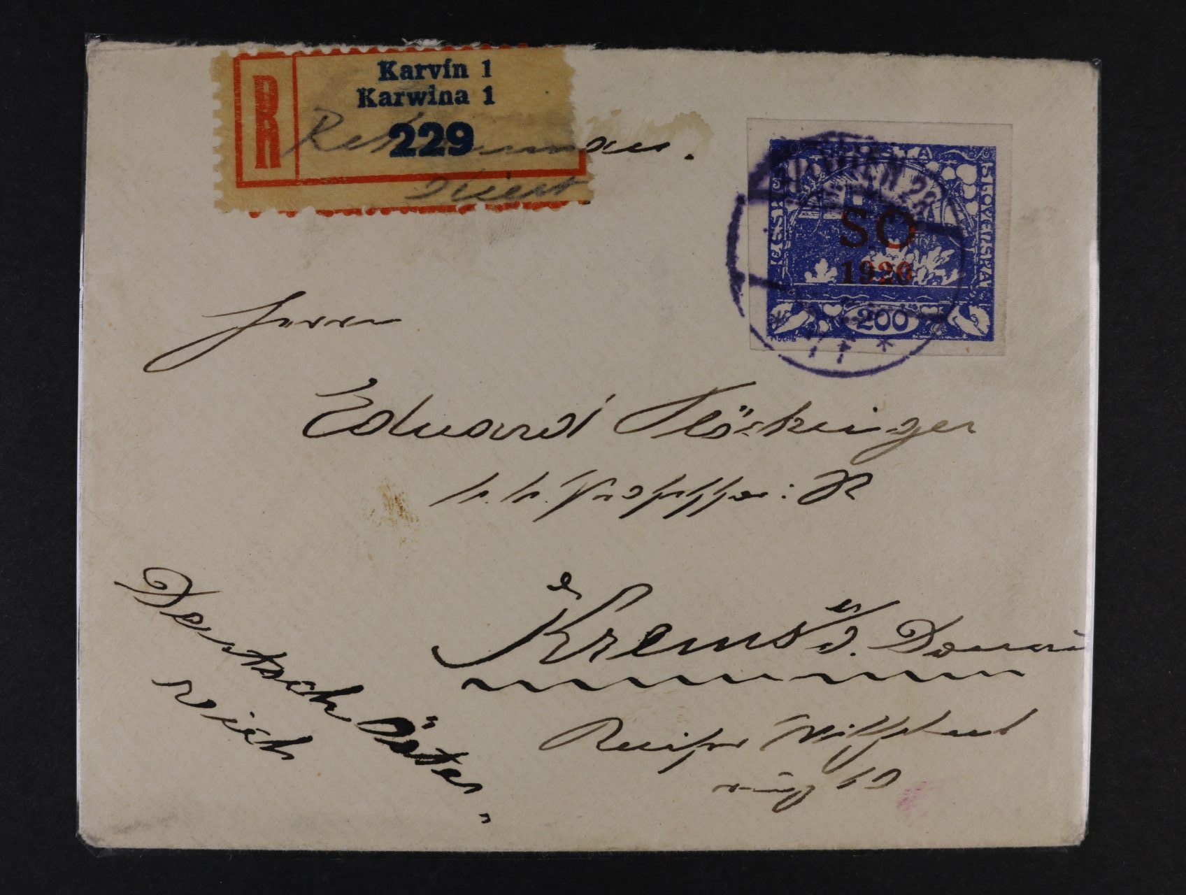 R-dopis z Karviné do Vídně frank. zn. SO č. 19 znehodnocenou ve Vídni raz. WIEN 28 , zajímavé