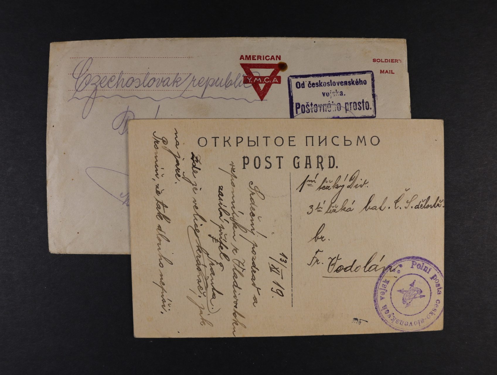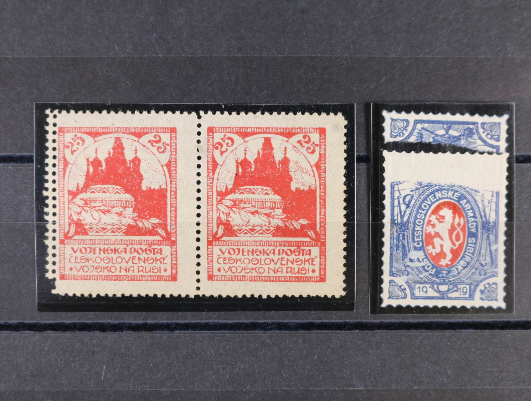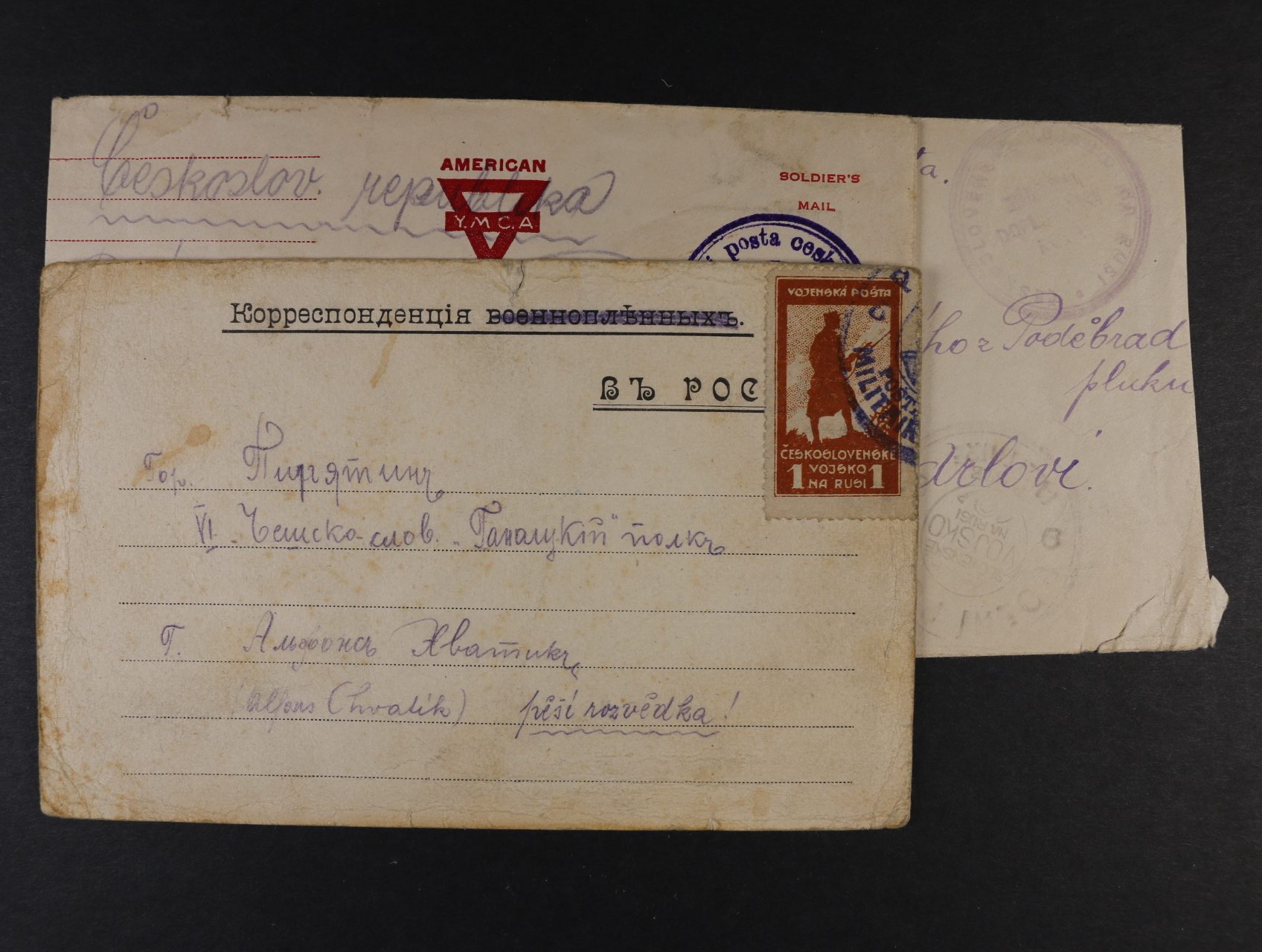 Sibiř - dvě celistvosti - 1x do vlasti s rámečkovým raz. Od československého ..., 1x mezi příslušníky čs. jednotek na Sibiři s dvoukruh. fialovým raz. Polní pošta československých vojsk