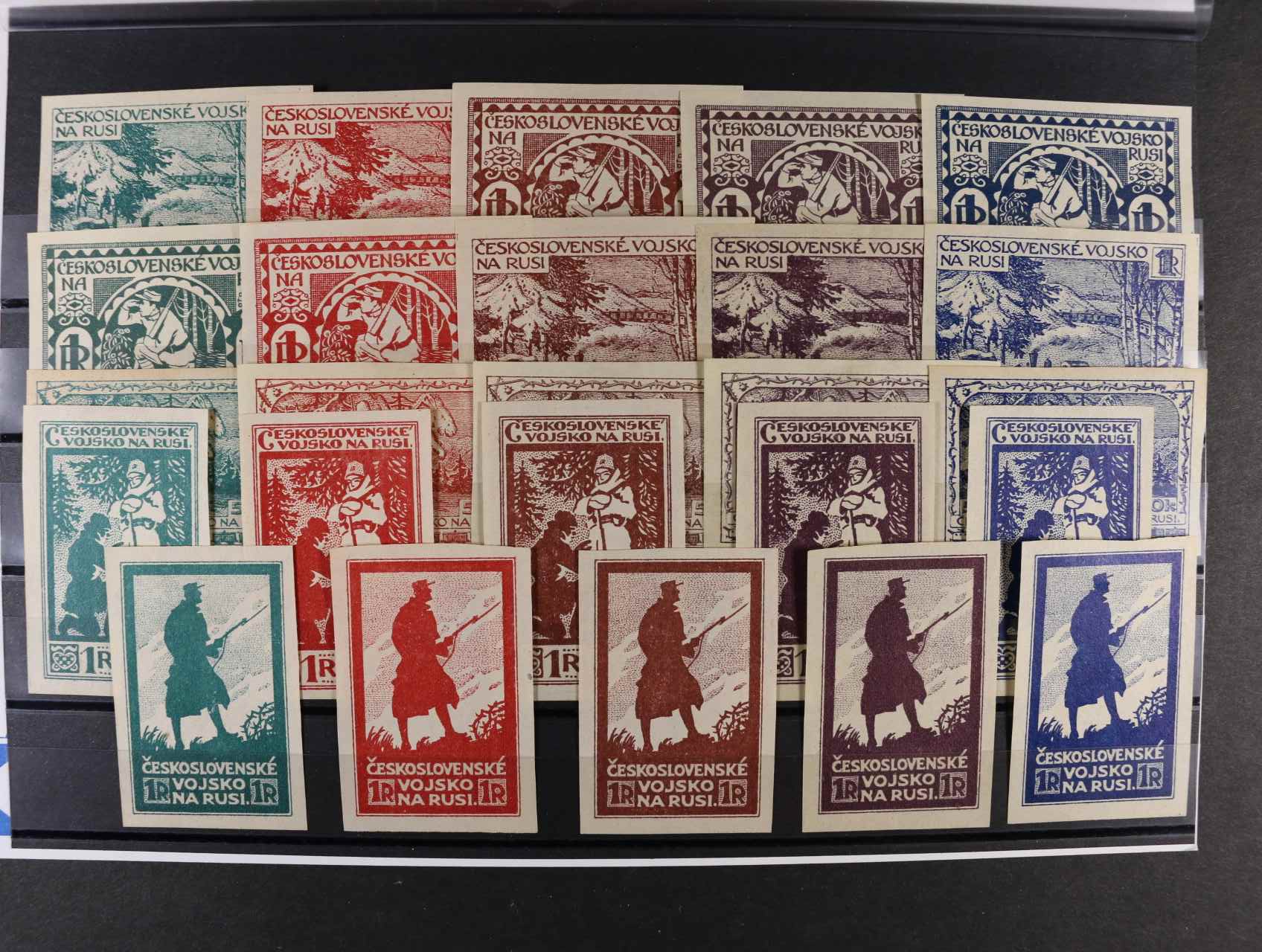 Sibiř - sestava 25 ks esejí pro legionářské zn. na Sibiři - 5 variant v různých barvách