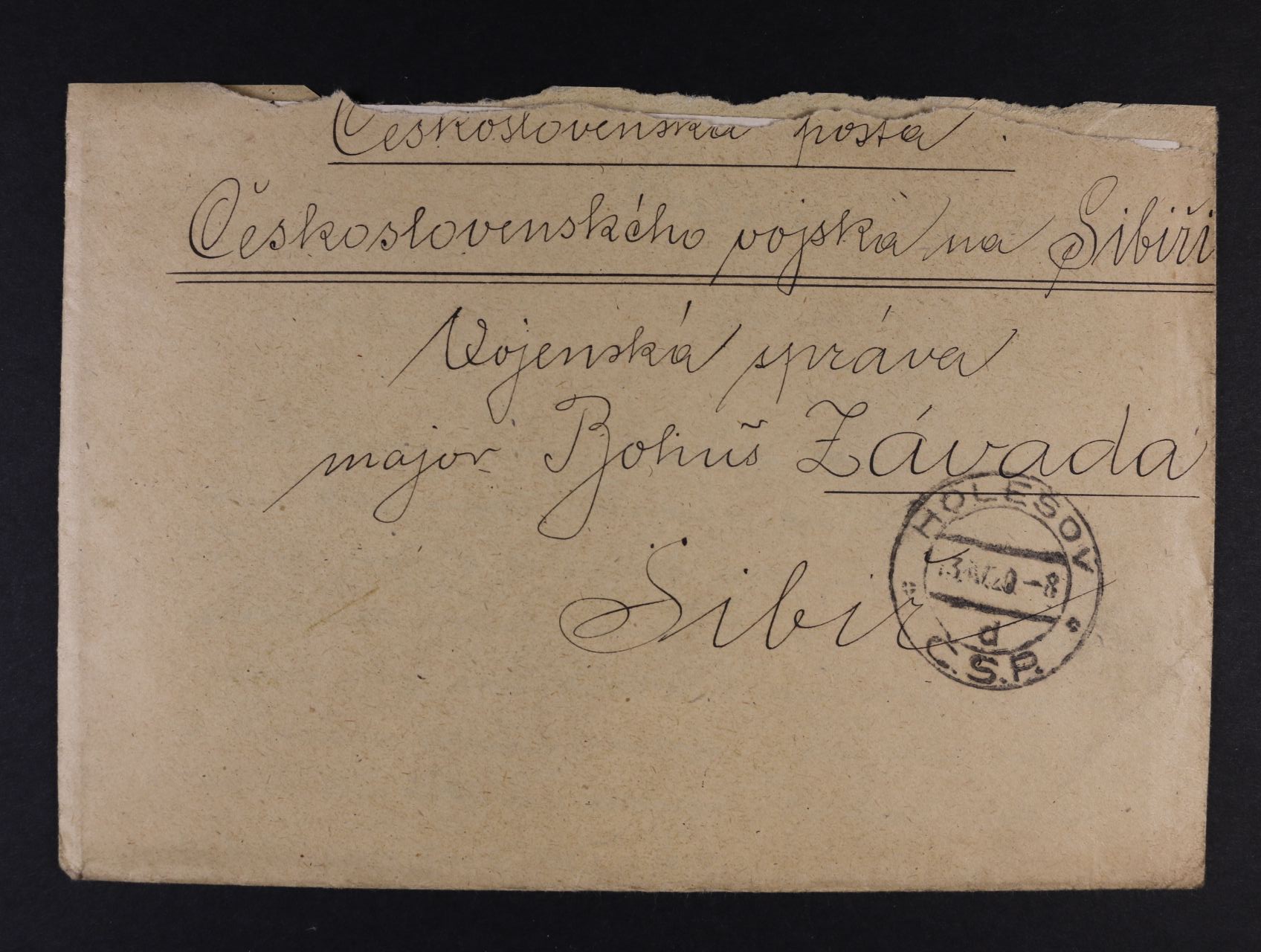 Sibiř - dopis vč. obsahu z Holešova na voj. správu čs. vojsk na Sibiři, pod. raz. HOLEŠOV 13.4.20, přích. fialové raz. POLNÍ POŠTA ČESKOSLOVENSKÝCH VOJSK